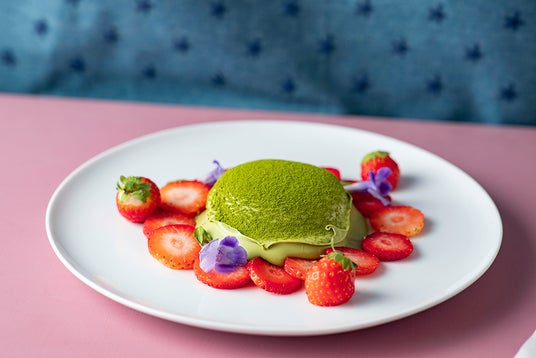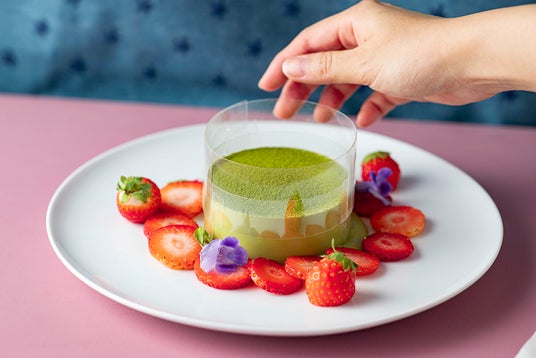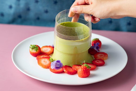 お客様の目の前でフィルムを外し、マスカルポーネと抹茶のクリームがとろけだすサプライズ。