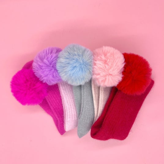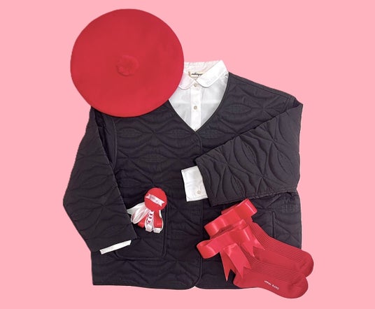 キルティングブルゾン¥33,000、ビッグベレー帽¥9,240、ビッグボウソックス¥3,630、ポンポンブローチ¥3,300(すべて税込)