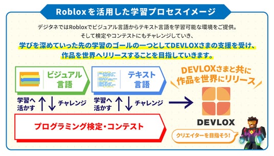 このプロジェクトでは、「デジタネ」のロブロックスコースでプログラミングを学習した生徒たちが、次の段階としてDEVLOXのコミュニティメンバーから技術的サポートやマーケティングコストの援助を受けながら、実際にRoblox(ロブロックス)におけるヒットゲームをリリースすることを目指す取り組みを試験的に開始します。これにより、プログラミング学習から実際のゲーム開発、さらにはリリースまでの一貫したサポート体制を構築し、若手クリエイターの育成と支援を実験的に行います。