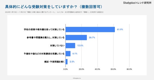 対策方法については、学校の授業での内容や教科書で対策している人が61.9%、それ以外に参考書や問題集を購入して対策している人が26.7%となっています。他の5教科とは異なり、基本的に学校の授業で習ったことや授業中に使った教科書で十分対策できる範囲なのかもしれません。そのためか、「対策していない」と回答した人も12.0%と少なくありません。