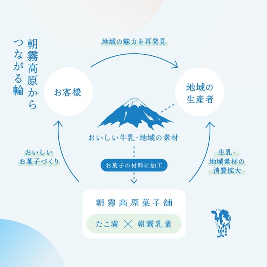 お菓子屋さんが乳業メーカーとタッグを組んだ一次産業直結スイーツブランド。富士山の麓、朝霧高原でとれた生乳をたっぷり使用、生乳を加工する上で出る副産物も使い、その美味しさを余すことなく活かしたお菓子を作り続けます。富士山や朝霧高原の自然をモチーフに、原材料・製法にこだわり一手間かけたお菓子を提供します。