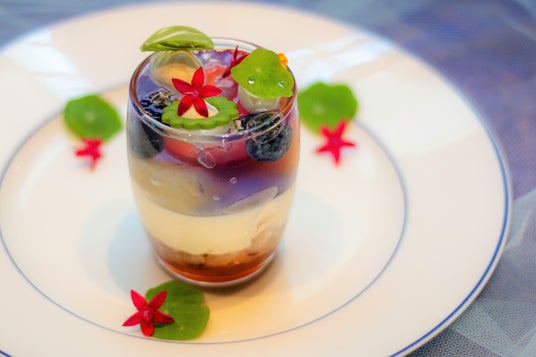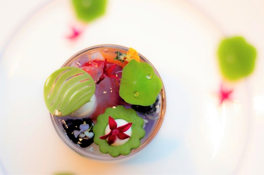 フランス産のフロマージュを使った濃厚なムースや柑橘類のジュレなどが層を成すグラススイーツ。自然をこよなく愛したモネの『睡蓮』を表現するため、フルーツやジュレの配置に工夫を凝らし、バタフライピーの色彩変化で幻想的な色と光を表現しています。水面をイメージした飾りで、可愛らしさと美しさを演出した見た目と甘美な味わいが楽しめる特別なスイーツです。