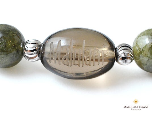 大地を象徴する厄除けの石「スモーキークォーツ」には、ブランド名でもある「Malulani」と刻印。