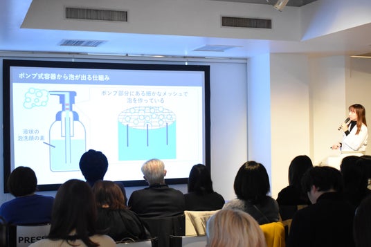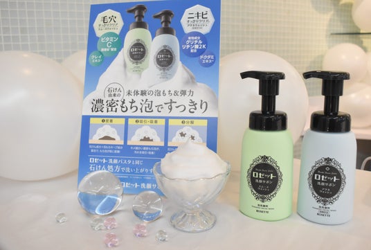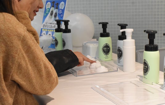 会場には「ロゼット洗顔サボン」と自社従来品の“泡の弾力”を比較体験することができるタッチアップスペースを設置。実際に「ロゼット洗顔サボン」の泡に触れてもらう事で、商品特長である濃密な“もち泡”をご体感いただきました。
