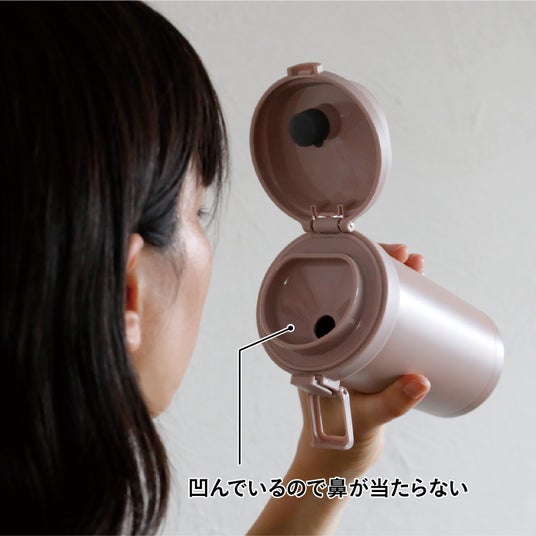 飲み口はプラスチック製なので金属臭がせず、フタを開けて傾けたときに顔に付かない構造なので