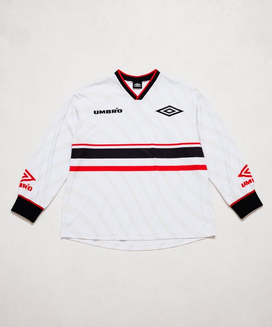 「UMBRO」がユニフォームを手がけた「Manchester United Football Club(マンチェスター・ユナイテッドFC)」の、かつてのユニフォームデザインを一部引用した一着。当時のウエアは襟付きでしたが、今回は襟なしのV開きにアップデートし、ロンTのような感覚で着こなせます。