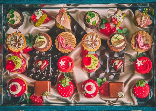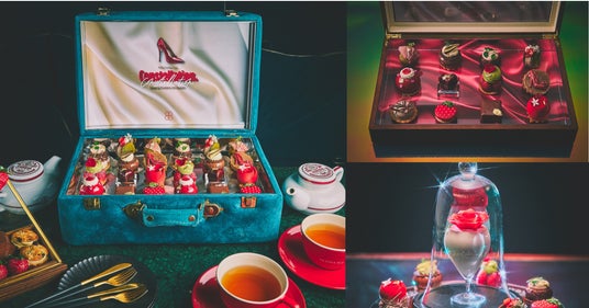 苺の甘酸っぱさとチョコレートの濃厚な風味が織りなすスイーツやセイボリーが、宝石箱に美しく彩られたアフタヌーンティー。
