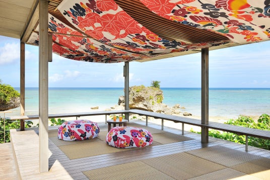 崖の上から浜辺へと続く散策路に東屋が点在する「海辺のテラス」が、イベント期間中は海風にアートがなびく「てぃんかじ(*)テラス」に変身します。5棟ある東屋では5人のアーティストの作品をテキスタイルにして天蓋のように飾るほか、大きなクッションのカバーリングにも使用します。作品は毎年更新される新作です。お気に入りの作品に包まれながらのんびりとカフェタイムを過ごせます。