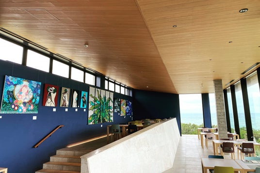 バンタカフェは、国内最大級のスケールを誇る海カフェです。ランドスケープの特徴を活かした展示を行う「あまくま(*)ギャラリー」は、アーティストが自ら選んだ場所に作品を展示します。高台のグリルレストラン「オールーグリル」では、参加アーティストの貴重な原画作品を鑑賞できる他、大きな窓辺に作品を飾る「ごろごろラウンジ」では、コバルトブルーの海と空、夕焼けに染まる情景と調和する作品をソファに腰かけて眺めます。他にも散策路や岩場にも作品が飾られ、施設のあちこちで自然と調和するインスタレーション作品を鑑賞できます。