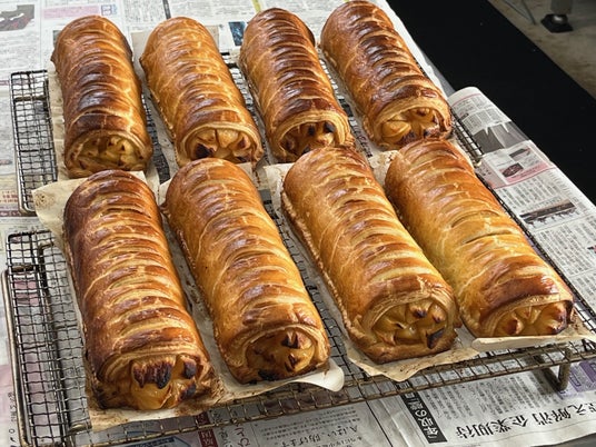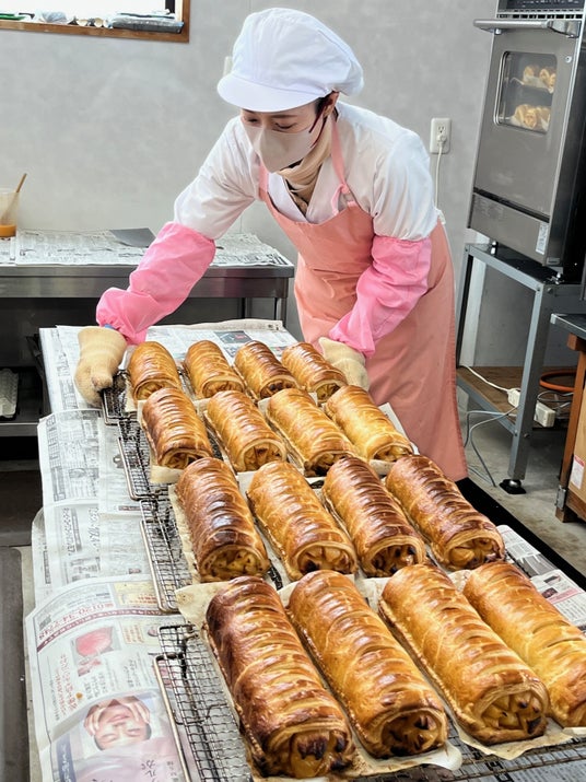 岐阜県高山市久々野町の特産である「飛騨りんご」をふんだんに使ったアップルパイ作りが、令和6年12月21日から始まり、同町無数河の久々野特産品加工場では、パイの焼ける甘く香ばしい香りに包まれながら女性スタッフがテキパキと作業を進めています(令和6年12月27日撮影)。
