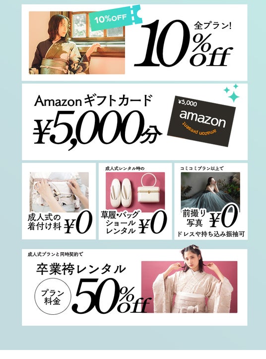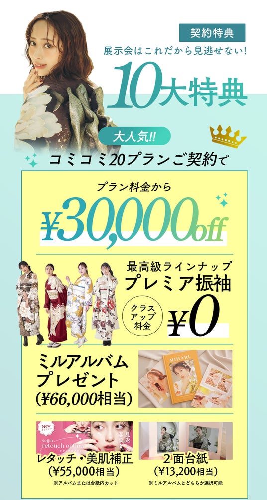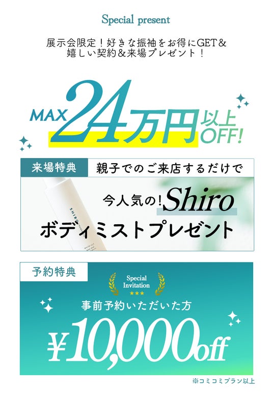 親子で来店するだけでもらえる人気ブランドSHIROのボディミスト、事前予約で¥10,000OFF、プレミア振袖通常¥20,000が無料、アルバムプレゼントなど豪華特典を多数ご用意。