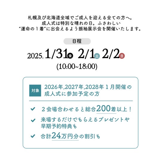 2025年初!振袖の祭典「札幌振袖展示会」の開催が決定。札幌・北海道内で2026年1月~2028年1月に成人式を迎えられるご家族が対象。