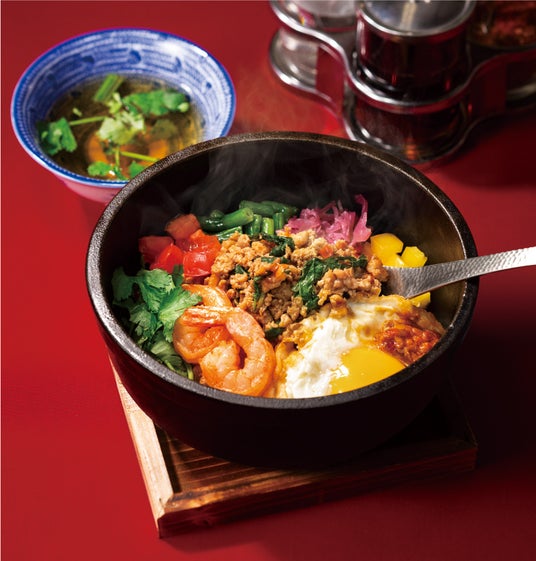 昨年販売し、ご好評につき復活した「石焼きガパオ」は、タイ料理で最もポピュラーな「ガパオライス」を、たっぷりの具材とともに韓国料理の石焼きビビンバのように石鍋に入れてアツアツに仕立てました。