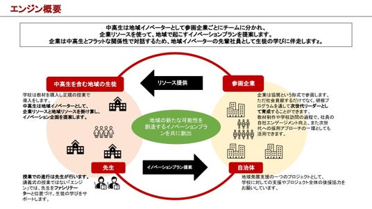 「よこすかengine」では、こうした横須賀市特有の地域特性を活かし、中高生と企業が協力して地域課題の解決策を探究します。生徒たちは「地域イノベーター」として、企業のリソース(事業の特色や強み)と地域のリソース(魅力や可能性)を組み合わせ、横須賀市をより良くする「イノベーションプラン」を考案し、企業に提案します。プログラムは学校の正規授業として約半年間実施され、企業の担当者は複数回学校を訪問し、対話をベースに生徒の自由で大胆な発想を引き出し、具体的なプラン構築をサポートします。企業の担当者は単なる指導者ではなく、生徒たちの探究プロセスに伴走し、自らも新たな気づきを得ながら共に地域課題に向き合います。
