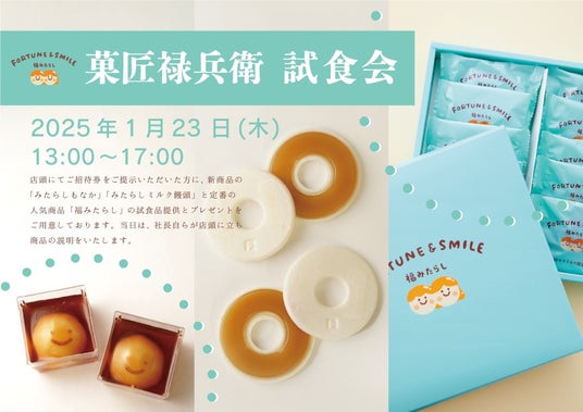 店頭に招待券をご持参いただいた方限定で、新商品「みたらしもなか」と定番の人気商品「福みたらし」・「みたらしミルク饅頭」の試食提供とプレゼントをご用意しております。当日は、社長自らが店頭に立ち商品の説明をいたします。