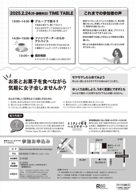 【問合せ先】:東京ウィメンズプラザトークカフェ事務局(株式会社おおわだぐみ内)