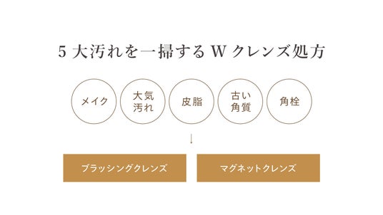 メイクはもちろん、花粉やホコリ・黄砂などの大気汚れ、皮脂、古い角質、角栓といった5大汚れを一掃すべく、ふたつのクレンズ機能を採用しました。