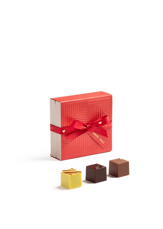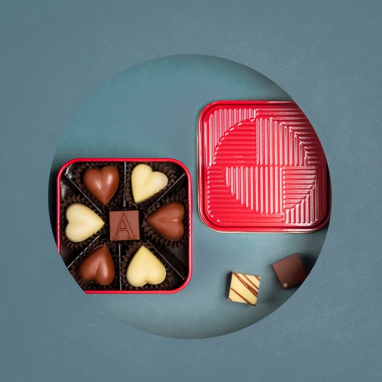 正方形のクラシックなボックスには、限定プラリネ4個入り、9個入り、16個入りの3サイズ、限定缶ボックスにはハート型のチョコレート12個とAロゴ入りのプラリネ1個が入ったアソートメントでご用意しています。