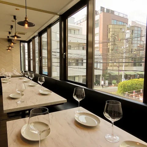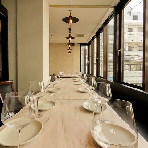 中目黒駅から徒歩1分という抜群のアクセスで最大20名まで利用可能な完全個室は、デート、歓送迎会、女子会、合コンに最適です。白を基調としたスタイリッシュな空間に広々としたテーブル席とカウンターを完備。非日常の時間をお楽しみいただけます。