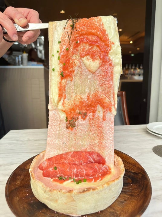 バスケット型のピザ生地の中に、熱々のブレンドチーズがたっぷり詰まった一品。目の前で一枚麺を持ち上げると、明太子とチーズが絡んだ一枚麺は圧巻です。