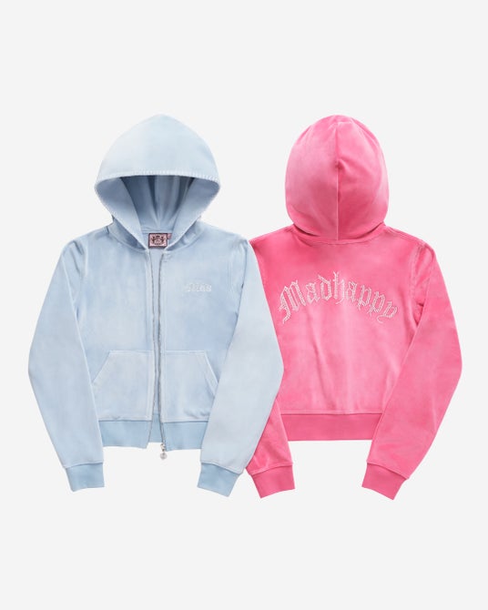 多彩なアイテムが揃う本コレクションは、両ブランドのルーツであるロサンゼルスへの敬意を込めて、ジューシークチュールの象徴的なロゴとマッドハッピーのハンドステッチディテールを組み合わせました。ジューシークチュールのシグネチャーであるベロアやフリース素材にラインストーンをあしらったジップアップ、フーディー、トラックパンツ、スウェットパンツをはじめ、ベビーTシャツ、ロングスリーブのベースボールTシャツ、トラッカーハットといったレイヤリングに最適なアイテムも豊富にラインナップしています。