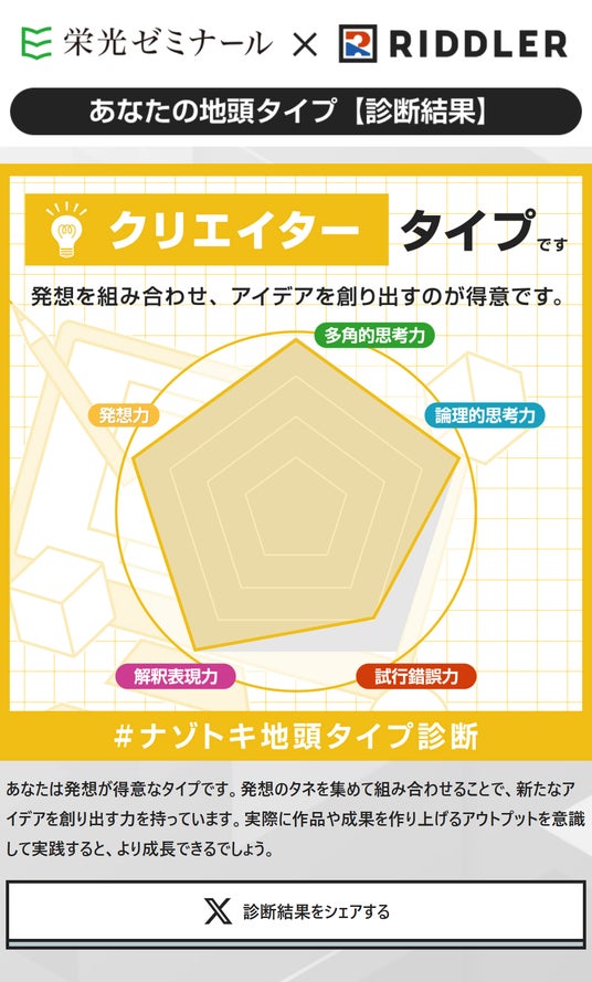 ナゾトキ問題は「多角的思考力」「論理的思考力」「試行錯誤力」「解釈表現力」「発想力」の5つのカテゴリーに分かれており、それぞれの正答数などを基準に思考のクセや特長を判定します。診断結果では、各カテゴリーの力を示す「地頭力チャート」と、「起業家タイプ」「ITエンジニアタイプ」「クリエイタータイプ」など9つの地頭タイプを表示します。