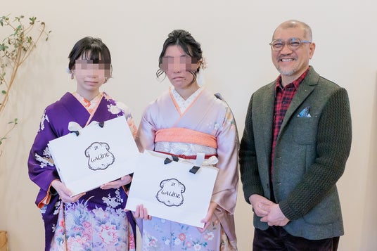 最初は緊張の面持ちだった女性たちも、美しい着物を着付けられ、ヘアメイクを施されると笑顔が戻り、サプライズでのLaline(ラリン)からのプレゼントを下地社長より贈呈されると溢れんばかりの笑顔になり、「幸せです!」と大喜びでした。