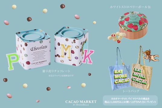 – カカオマーケット バイ マリベルの商品を税込11,000円以上お買い上げされた方には、ノベルティとして「Eat More Cacao」と記されたトートバッグをプレゼント。限定1,000個(ベージュ500個/ブルー500個)ですので、お早めにお越しください。