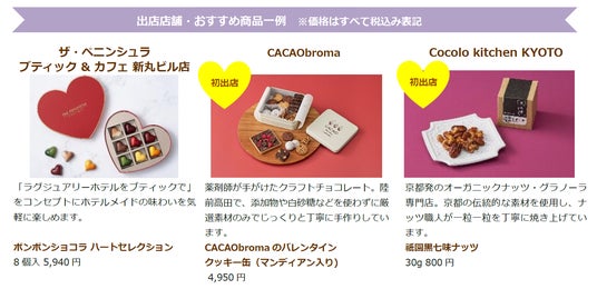 旬の柑橘の品種ごとに作り上げるオランジェットを取りそろえる専門店『ORANGE kikaki』からは、濃厚でいて優しい甘さのある柑橘「津之輝」を使用したオランジェットや、“美味しさと健康”を考えた薬剤師監修のオーガニックチョコレートを提供する『CACAObroma』によるこだわりクッキーの詰め合わせなど、個性あふれる初出店の5店舗に加え、丸の内エリアでも絶大な人気を誇る『ショコラティエ パレ ド オール』や『ピエール・エルメ』など、今年も名品ショコラを含め全21店舗が登場します。