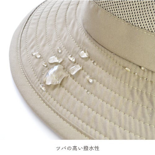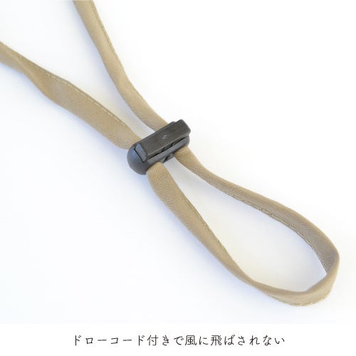 アウトドア向けのこだわり: 屋外での利用に着目し、小雨を気にしない高い撥水性。風による吹き飛び防止に扱いやすいドローコードを採用しました。また、ツバは柔らかいので小さく畳んで丸めることができ、持ち運びも邪魔になりません。