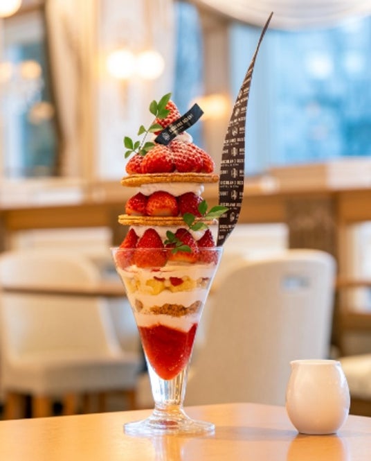 旬のイチゴを楽しめる見た目も可愛らしいフェアメニューが多数登場いたします。一番のおすすめはイチゴをたっぷり使用した高さ約40cmの「苺のミルフィーユパフェ」。一人で食べるのはもちろん、友達ともシェアできる商品です。