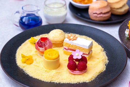 マンゴーでバラの花飾りを表現したスイーツやミモザの花をイメージしたタルトなど、フラワーティーと楽しむ春のフラワーガーデンをテーマにした新メニュー登場