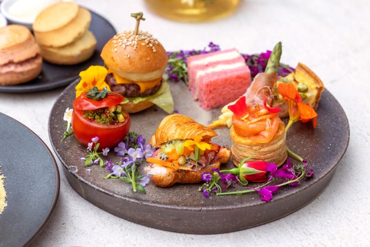 色とりどりの花が咲き誇る春のフラワーガーデンをイメージした「スプリングフラワー アフタヌーンティー」は、エディブルフラワーや花のモチーフをあしらって仕上げる色彩豊かなスイーツとセイボリーが特徴です。マンゴーでバラを表現した「マンゴー花飾り」や、ミモザの花をイメージしたタルトなど6種類のスイーツと、食材が持つ赤や黄色、オレンジなどの自然な色を活かしたカラフルなメニューに、それぞれ異なるエディブルフラワーを合わせた6種類のセイボリーがそろいます。