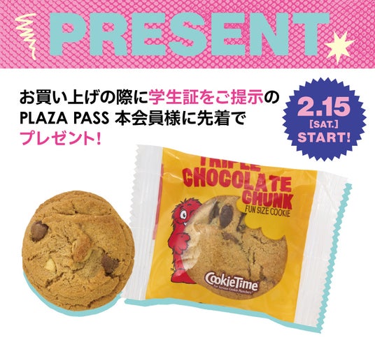 期間中、お買い物の際に学生証をご提示いただいたPLAZA PASS 本会員のお客様に先着で「クッキータイム トリプルチョコ チャンククッキー 1P」をプレゼント!プレゼントはなくなり次第終了です。このスペシャルな企画を見逃しなく!