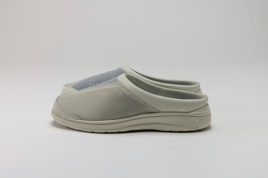 CAFをベースに使い勝手の良さを探求しアレンジ。アッパ一部分に通気性の優れた2層構造のメッシュ材を配置することで快適性を向上。インソールはパンチング仕様のベースとヒールクッションの2つのパーツで構成。Ag+抗菌機能も搭載し、履き心地の良さはもちろん、利用後の清潔性にも配慮。脱ぎ履きしやすいサボタイプの25春夏シーズンリミテッドモデル。