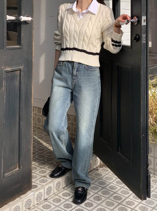 ケーブル編み ニット(ショップ名:Attrangs JAPAN)シャツとレイヤード風デザインで、袖と裾の配色編みのアクセントが効いたニット。ウォッシュドデニムとブラックの小物合わせでクールに。