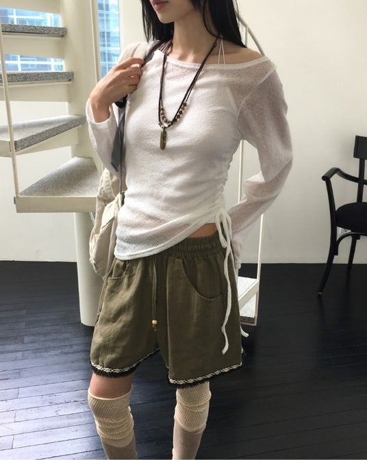 シャーリング シースルー ニット(ショップ名:wonderwonder)軽やかな透け感とシャーリングを絞ったアシメスタイルで個性をプラス。アースカラーのネックレスやフリンジパンツでボヘミアンテイストに。