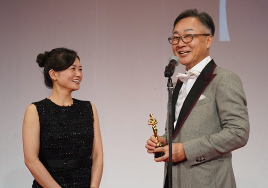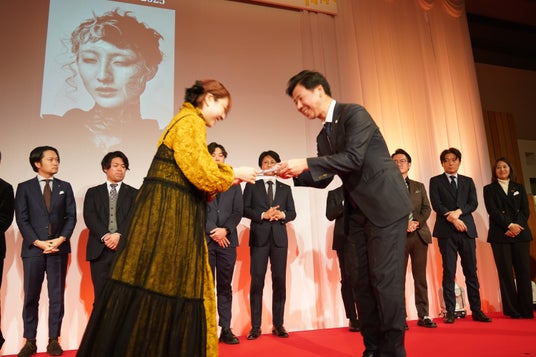 表彰式では、サプライズ企画も実施されました。昨年、アルテジェネシスが協賛した映画『侍タイムスリッパー』に吉村社長が出演したことを記念し、「助演男優賞」の授与が行われました。プレゼンターとして、同映画のヒロイン役を務めた女優・沙倉ゆうのさんが登壇し、会場を盛り上げました。