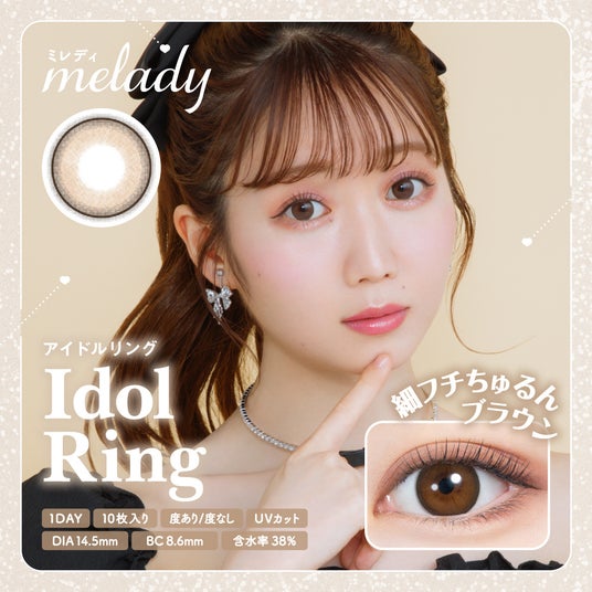立体感のある瞳を演出してくれる、甘いショコラブラウンカラーの「Princess Chocolat(プリンセスショコラ)」と、meladyらしくサイズにこだわった大きめ水光レンズの「Star Glow(スターグロー)」は、瞳をきらきらと見せてくれるレンズデザインになっています。ブランド初のしっかり盛れる太フチデザインを採用することで、くりっとした大きな瞳の印象となり、まさに“可愛さをぎゅっととじ込めた”盛れる2カラーです。また今回の新色レンズには、保存液にヒアルロン酸の約2倍の保湿力を持つ潤い成分「MPCポリマー」を配合。含水率も55%にすることで、今まで以上に自然で快適なつけ心地を目指しました。
