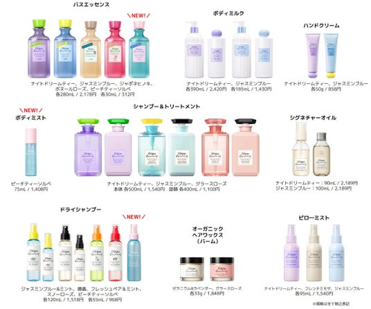 人気の〈ジャスミンブルー&ミント〉、シーンを問わずお使いいただける微香タイプ、ダイアンボヌールを象徴する〈スノーローズ〉、そして新発売のアイスドライシャンプー〈 ピーチティーソルベ〉の香りを含めた全4種類をご用意しました。