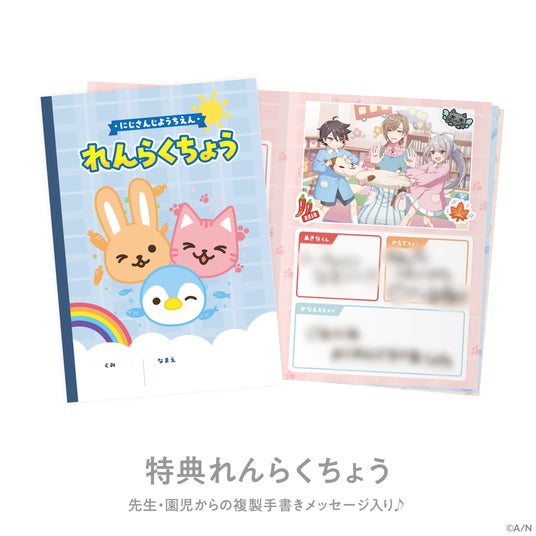 にじさんじオフィシャルストアで『にじさんじようちえん』グッズを4,000円(税込)以上ご購入いただいたお客様全員に「れんらくちょう(全1種)」をプレゼントいたします。ここでしか見られない、先生・園児からの複製手書きメッセージ入りです!