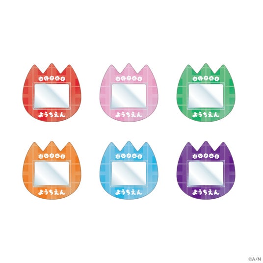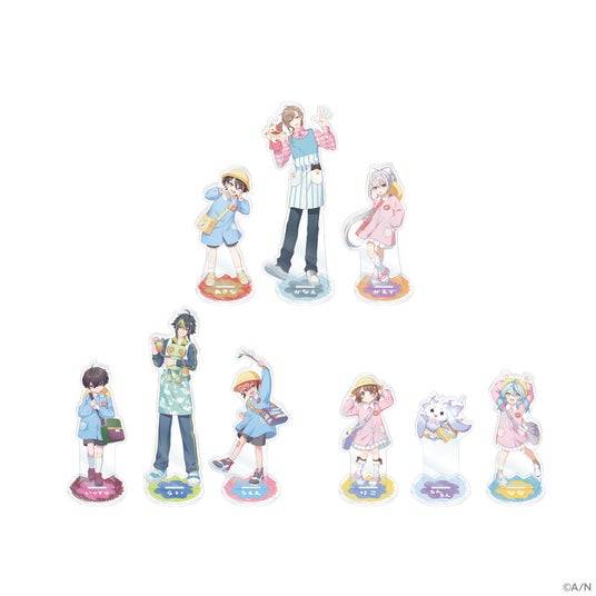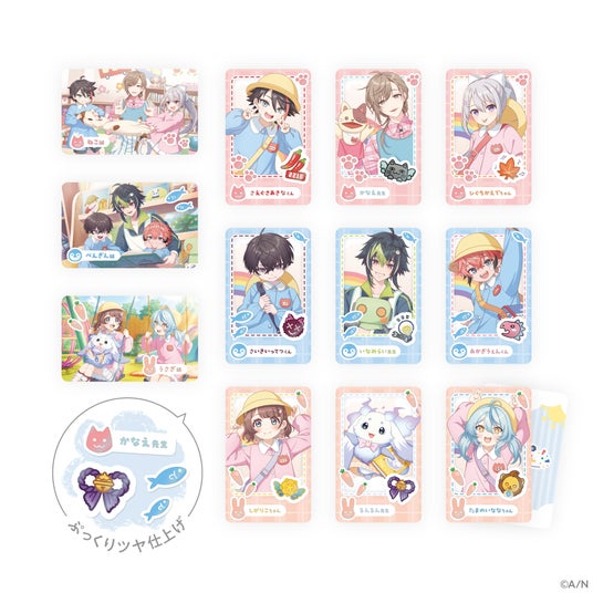グッズラインナップは、ランダムフォト風カード、アクリルスタンド、ステッカーセット、クリアファイルの他にも、入園時必須アイテムのおなまえバッジ、にじぱぺ園服セットの6種類。