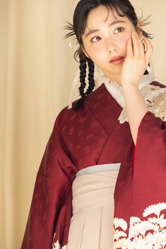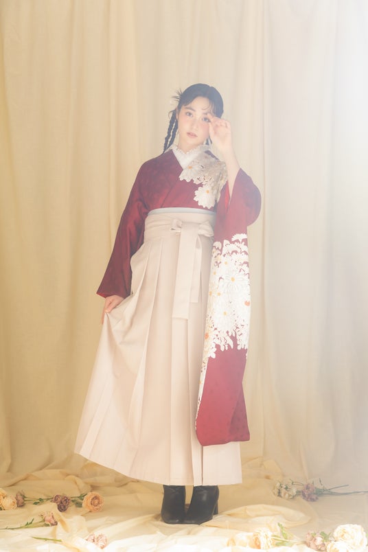 アイボリーの袴とのコーディネートで、淡くトレンド感のあるスタイルに。