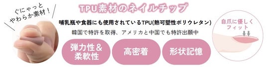 通常のネイルチップにはない、ぐにゃっと柔らか素材で、哺乳瓶や食器にも使用されているTPU(熱可塑性ポリウレタン)を使用し、自分の爪に合わせてチップを形状記憶させることで、より自然で自爪のような感覚で使用できます。韓国で特許を取得しており、アメリカ・中国でも特許出願中になります。