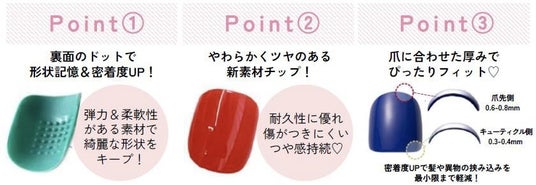 裏面がドットになっていて、綺麗に爪に密着し綺麗な爪の形をキープします。耐久性にも優れ、傷がつきずらい為より持続してネイルをお楽しみいただけます。爪先とキューティクルでチップの厚さが異なる為、髪や異物の挟み込みを最小限まで抑えます。