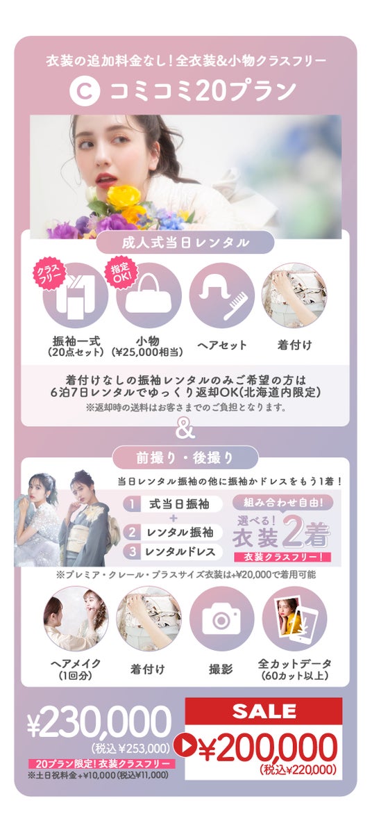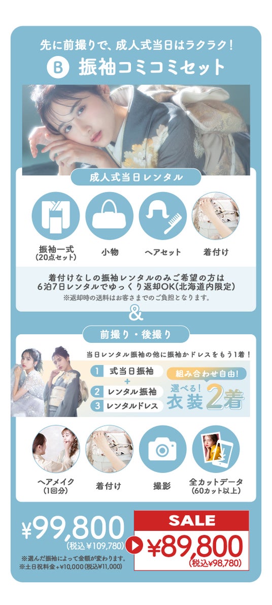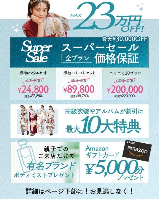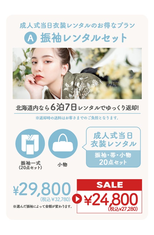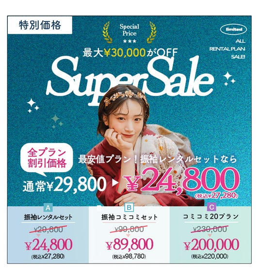 スーパーセールで全てのプランが割引に。最安プランの振袖レンタルセットは¥24,800+税からご案内が可能。