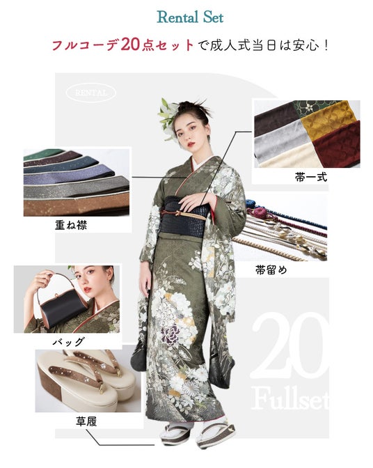 着付け小物一式から草履やショールなどが全てセットになったフルコーデでのレンタルが可能なので当日は安心です。