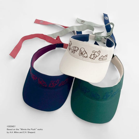 でんぐり返しをしている「プーさん」がキュートなサンバイザー。バックのリボンには「プーさん」の大好きなハチミツが入ったハニーポットが刺繍されています。リボンは取り外し可能です。