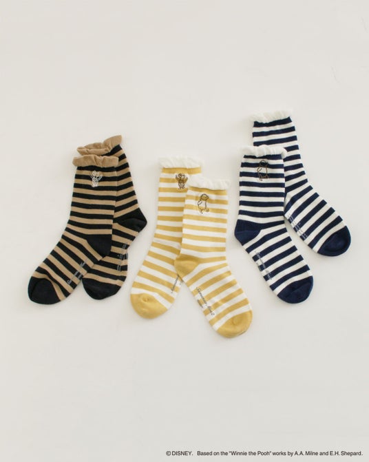 フリル×ボーダーがコーデのアクセントになるソックス。左右で異なるキャラクターの刺繍にも注目です。