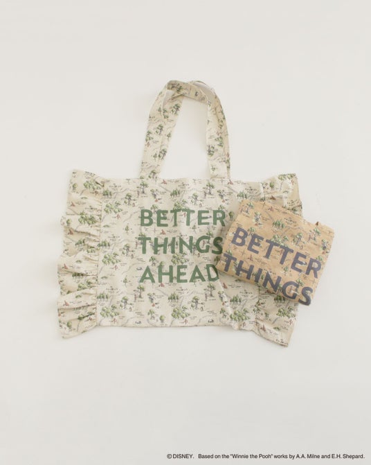 「Samansa Mos2」では、「クラシック プー」のイラストを描いたアップリケが可愛らしいナチュラルな色合いのTシャツや、スリーブにフリルデザインを取り入れた爽やかなボーダートップス、「プーさん」が暮らす100エーカーの森をイメージしたトートバッグなど全4アイテムをご用意。
